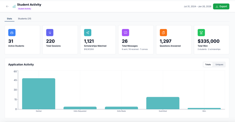 You'll have access to a simple dashboard that shows which students are engaged, how many scholarships they're applying to, and how much they've won. We also provide easy-to-share reports for funders and leadership.