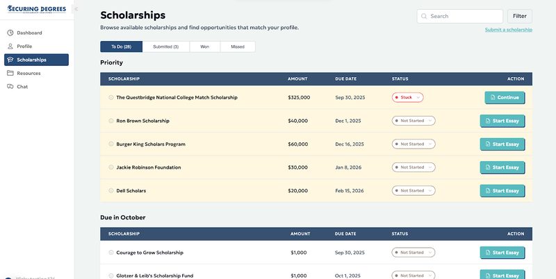 The Securing Degrees platform is a robust, all-in-one resource hub designed to guide students through every step of their scholarship journey. Accessible via desktop or our mobile app, the platform offers: