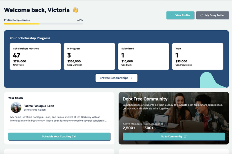 Our expert coaching covers every step of the process, from crafting compelling essays to mastering application strategies, so students don’t just find scholarships, they win them. Students access our tech-enabled platform for personalized scholarship matches, essay editing, deadline tracking, and accountability tools that make the process seamless and achievable.